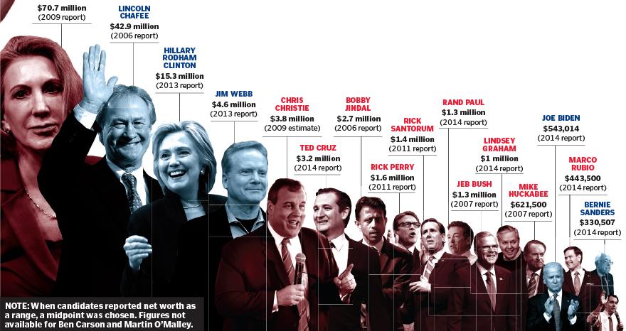 I personally believe the following article is an attempt by the Boston Globe to help take some of the focus off Hillary as being, Out of Touch and inability to relate to the Common folk ... you get the idea. So what they've done here is focus on the wealth of ALL the potential candidates instead. Saying all that, it's still an interesting article none the less: