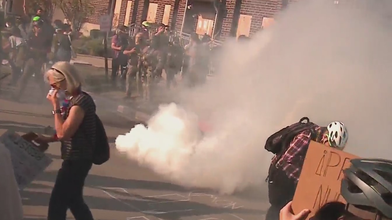 The video shows authorities quickly apprehending one protester — donning a helmet, gas mask and Captain America shield — who hurled a canister of tear gas back at agents during the skirmish.